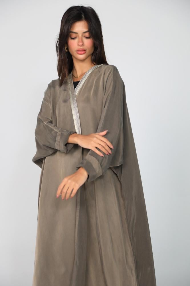 004لون العباية : بني جملينوع القماش : حرير مغسول .الطرحة : ليزر بني .color :brownMaterial :silkscarf : brown