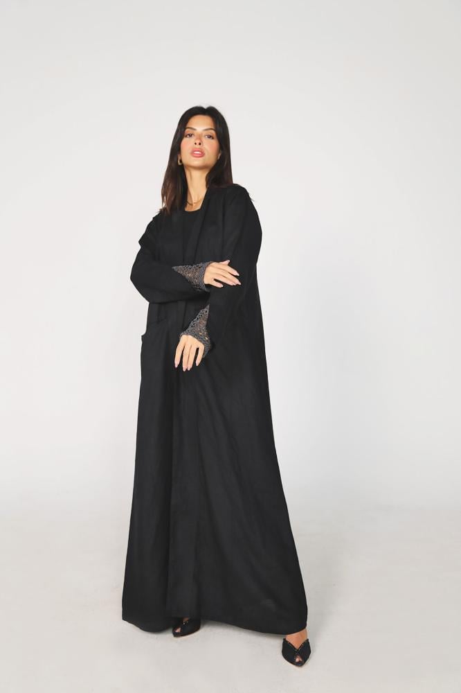 009لون العباية : اسود .نوع القماش : لنن طبيعي.الطرحة : ليزر اسود.color :blackMaterial :leninscarf : black