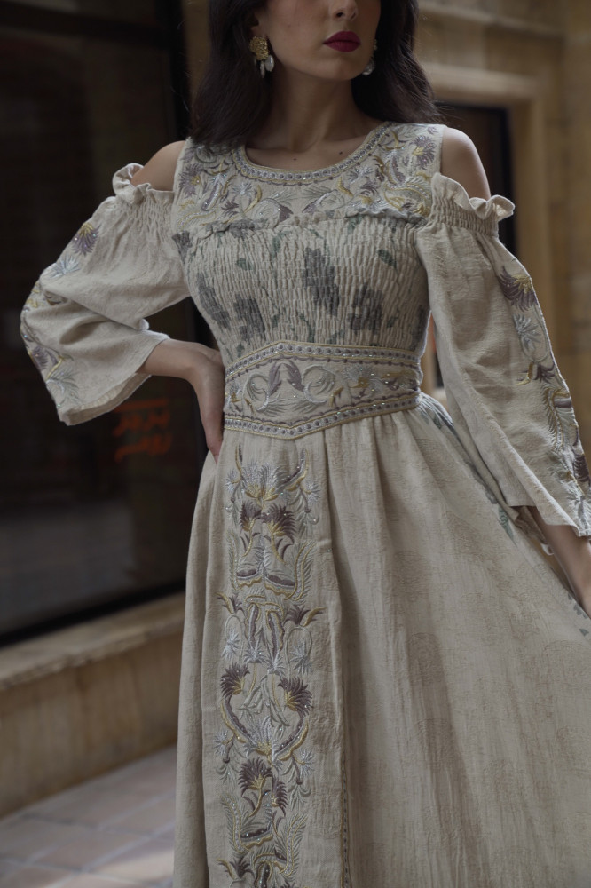 الوصف : جلابية بتصميم عصري صممت بياقة دائرية واكتاف عارية مع اكمام مسدلة مصنوعة من اللنن المشجر مع اضافة تطريزات يدوية