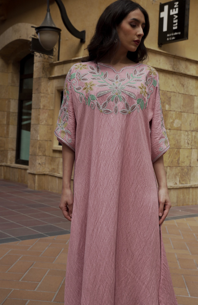 الوصف : جلابية كلاسيكسة مصنوعة من الكريب بأكمام قصيرة واسعة وقصة فضفاضة مريحة أضفنا تطريز من الزهور والخرز على الصدر ليمنحك مظهرآ انثوياً جذاباً